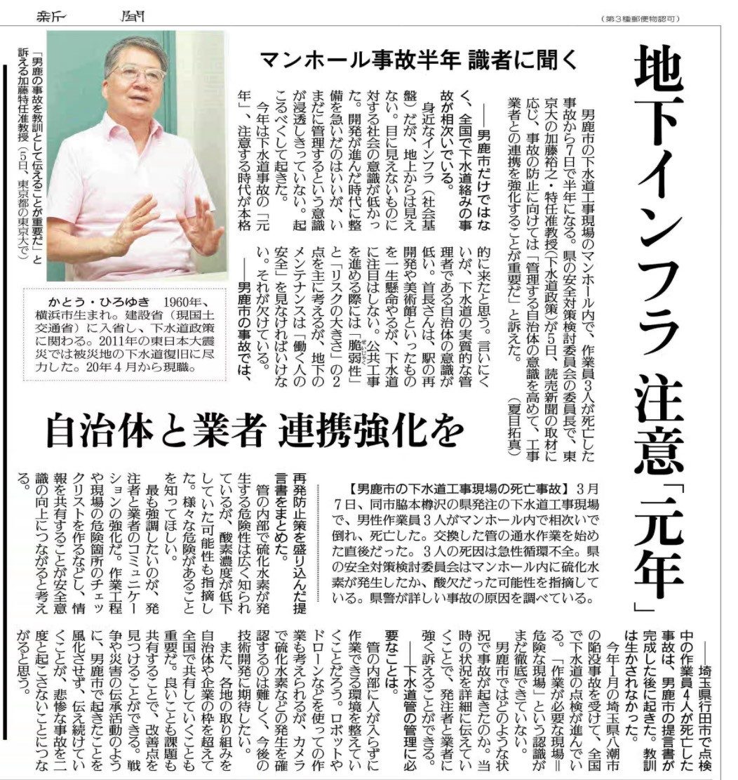加藤教授が、Kyodo Weekly(共同通信社2025.6.16号)に「埼玉・八潮の道路陥没から考える上下水道の未来」を投稿しました