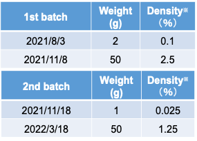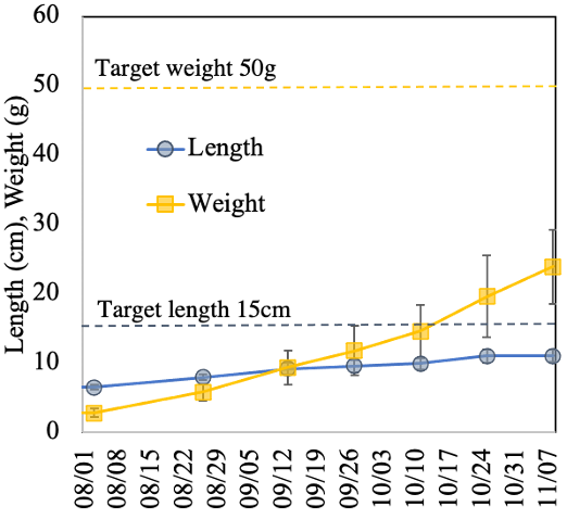 Winter Ayu growth (12.6 ±1.3 cm, 28.0 ±10.1 g, 2nd batch) was significantly higher than that in summer experiment (11.1 ±0.9 cm, 24.0 ±5.3 g, 2nd batch) after 3-month rearing (p<0.05) (Fig. 2).