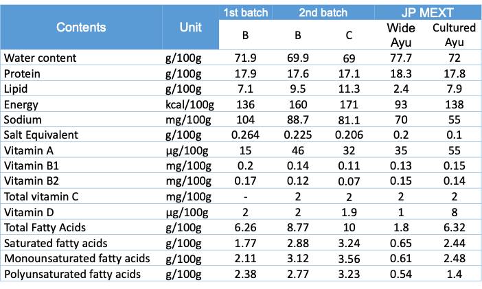 Protein, vitamins (B1, B2, C) and fatty acid contents in TWW Ayu were comparable with those in wild ayu and commonly cultured ayu (source: https://fooddb.mext.go.jp/ ).