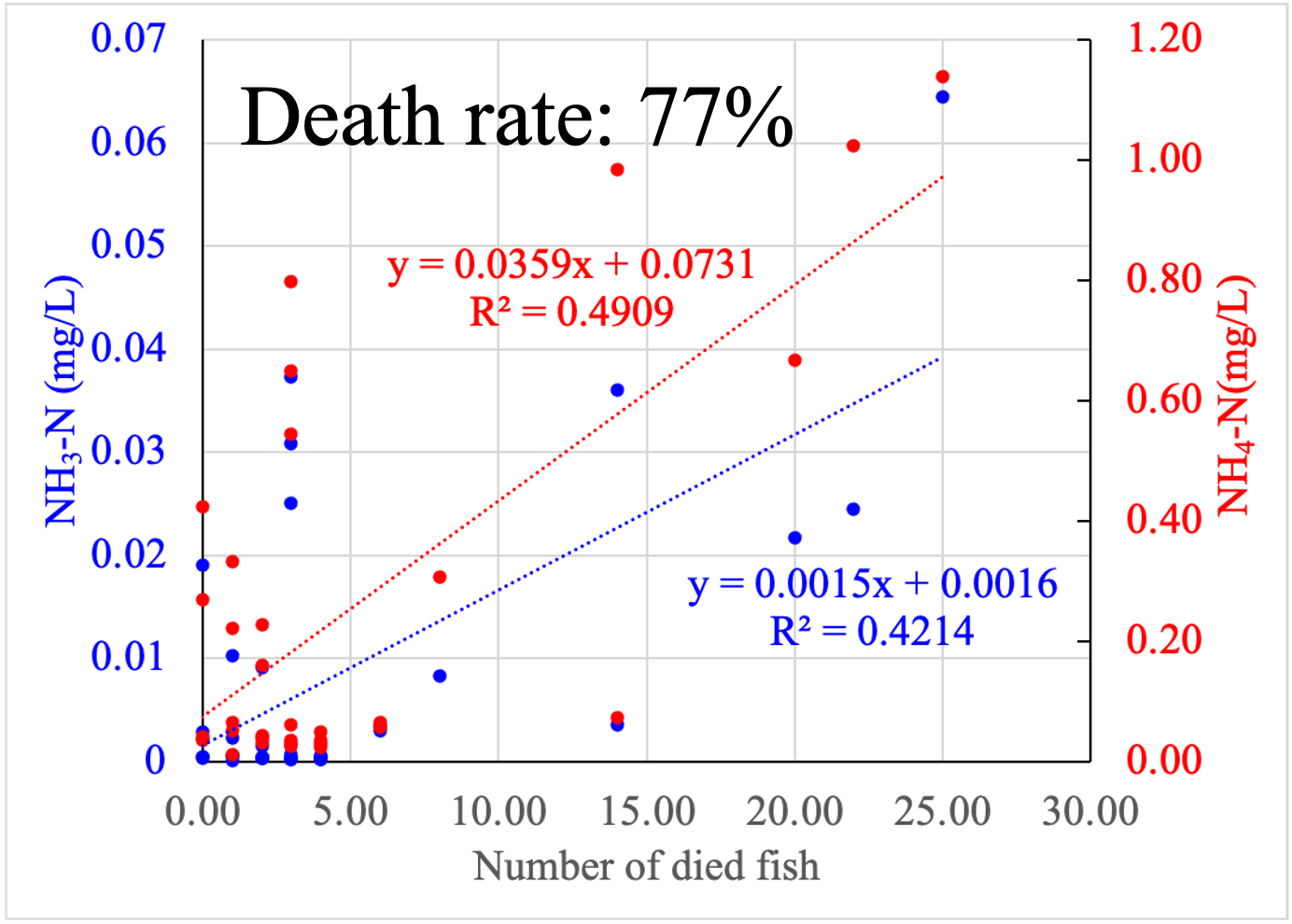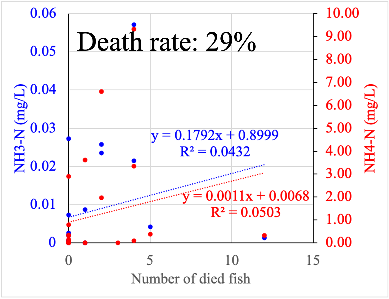 The number of dead fish in summer batch had a significantly positive correlation with NH4-N and unionized ammonia (NH3-N)* concentrations (Fig. 3).