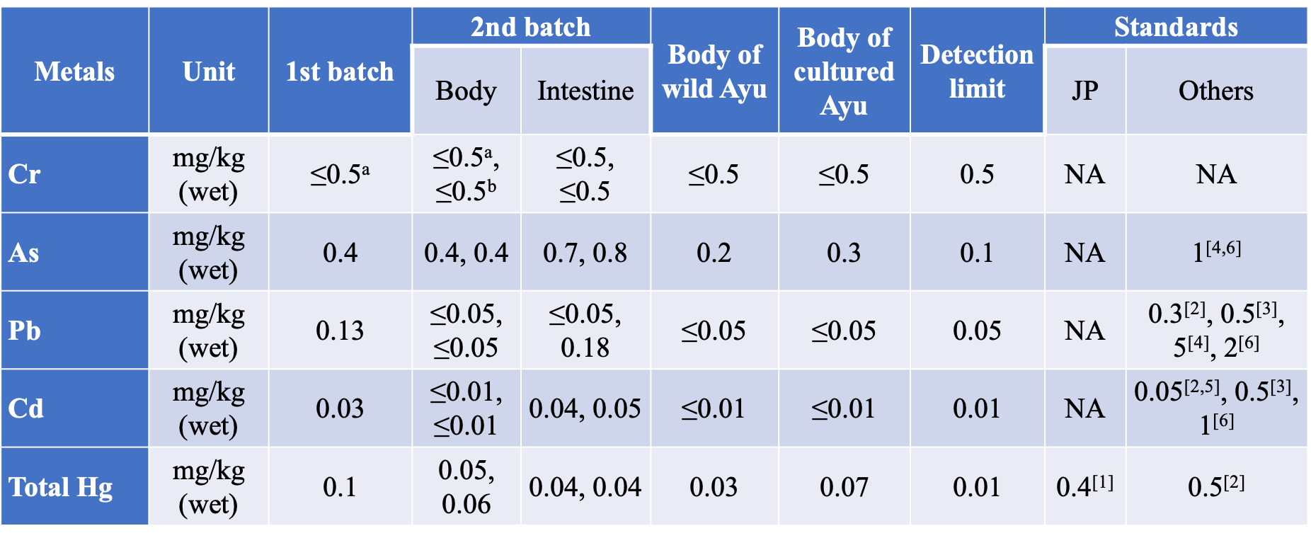 a: 1st value is after 3-month culture、b: 2nd value is after 4-month culture [1] FAO. Compilation of legal limits for hazardous substances in fish and fishery products (CLL) in Japan. [2] Official Journal of the European Union. COMMISSION REGULATION (EC) No 1881/2006. [3,4,5,6] FAO. CLL in Germany, India, Netherlands, New Zealand, respectively.