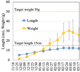 Winter Ayu growth (12.6 ±1.3 cm, 28.0 ±10.1 g, 2nd batch) was significantly higher than that in summer experiment (11.1 ±0.9 cm, 24.0 ±5.3 g, 2nd batch) after 3-month rearing (p<0.05) (Fig. 2).